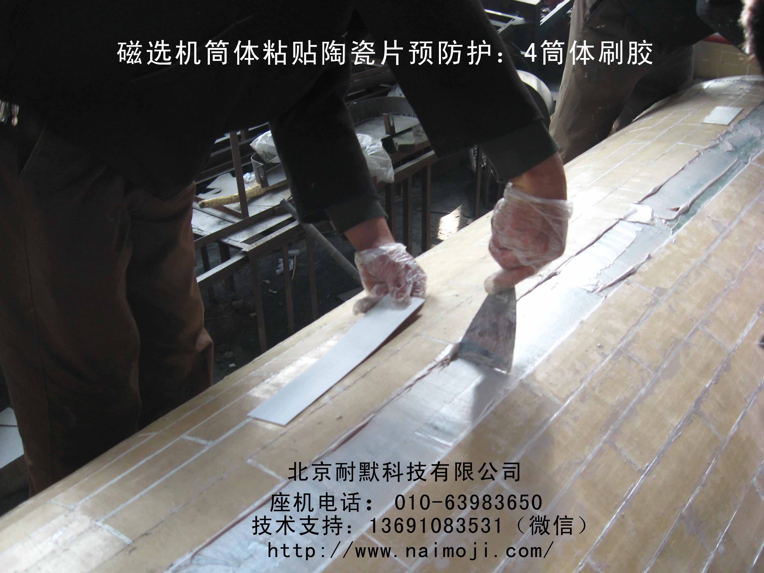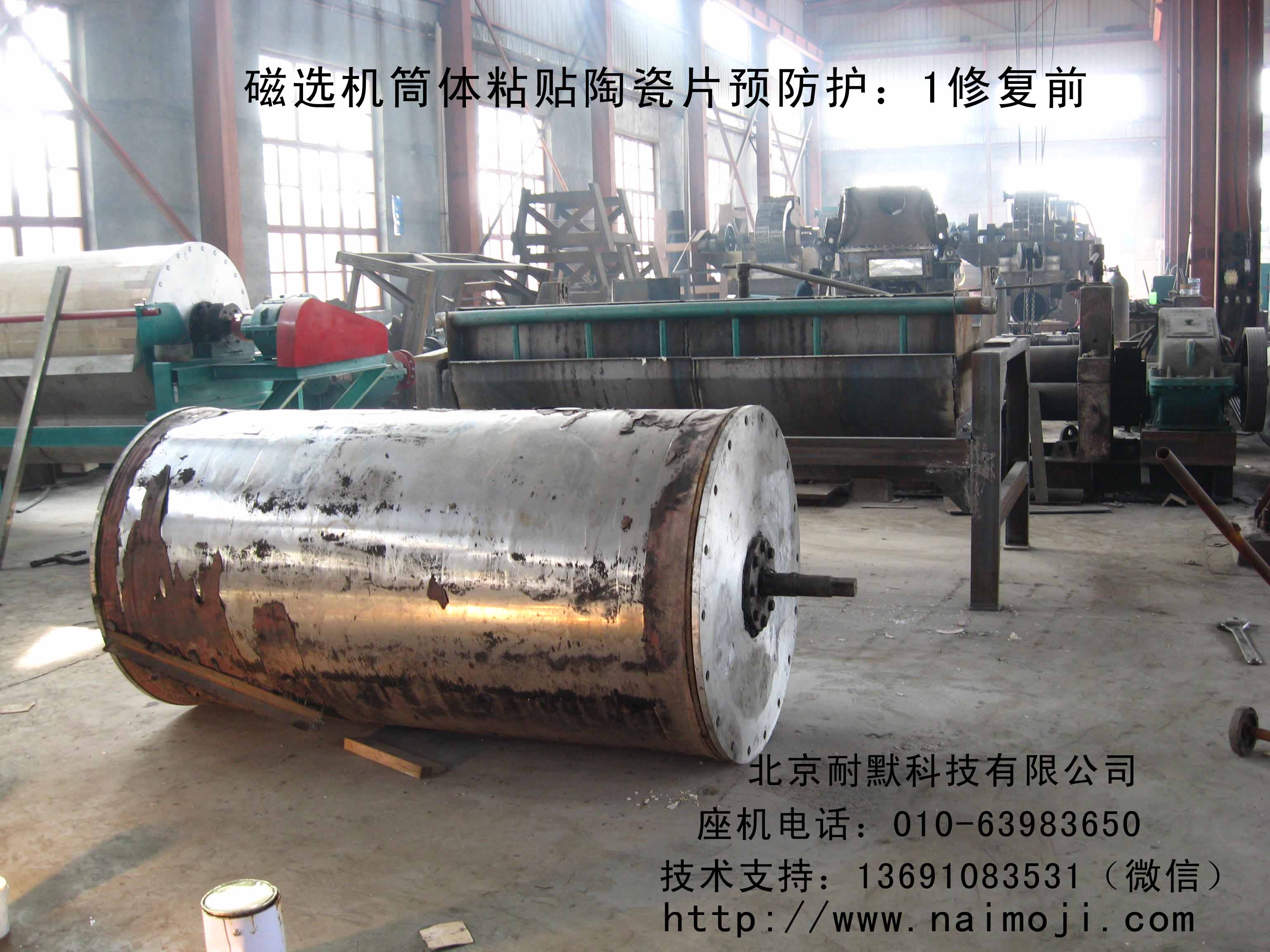 北京耐磨公司經過三年的技術攻關終于攻克了磁選機不銹鋼滾筒磨損難題, 選用高強度陶瓷膠將95氧化鋁陶瓷片粘貼在筒體表面,現將工序說明如下: